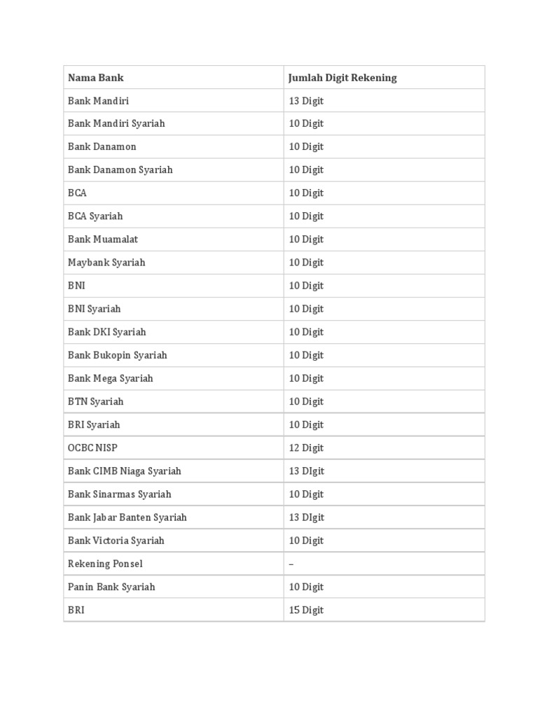 Berikut ini nama bank dan jumlah digit rekening yang dimilikinya. Shuterstock Nomor rekening bank itu bersifat unik. Melalui Jumlah Digit Nomor Rekening.